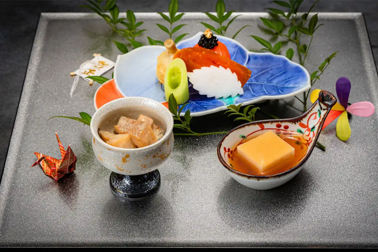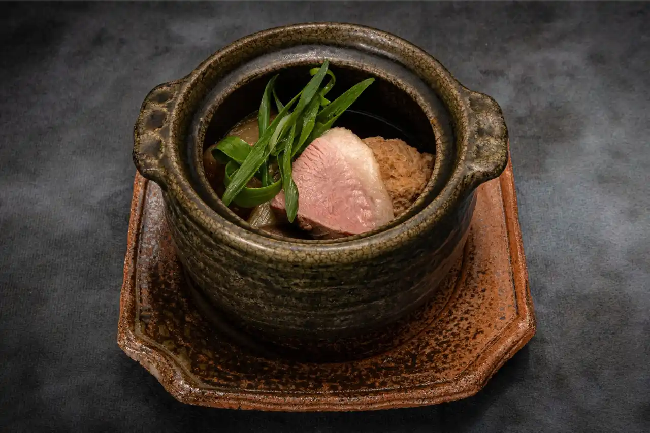 なかでも注目すべきは、富士山サーモンを使った手毬寿しに、約一か月かけて丹念に仕上げた自家製からすみを添えた前菜。祝いの席にふさわしい華やかさと、熟成による濃厚な旨味が魅力です。さらに、金目鯛真薯は、脂のりの良い金目鯛をなめらかに成形し、本枯れ節と利尻昆布で取った一番出汁とともに、香り高く仕上げた椀物。国産合鴨を使った団子とロースを、原木椎茸や九条葱など冬野菜とともに煮浸しにした台の物は、体を芯から温める一品です。 |