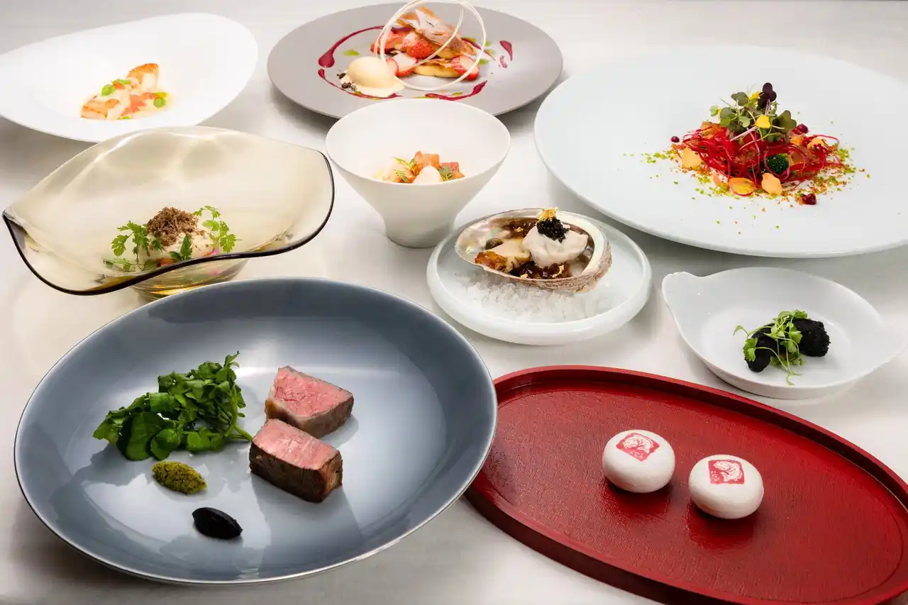 コンテンポラリーフレンチは、和と洋の技法を融合させた芸術的なコース。伊勢海老や黒毛和牛などの高級食材に、地元静岡の旬の恵みを加え、質の高い食材を楽しめる華やかな構成です。 |