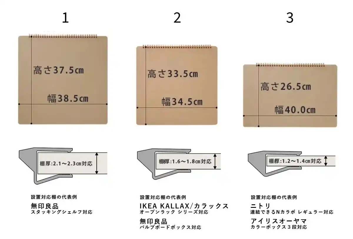 棚厚によって様々な棚に設置が可能!3タイプのサイズをご用意しました。 |