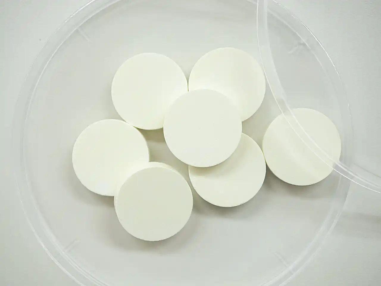 | 本開発では、化粧品成分を打錠技術で固形化し、安定性を高めつつ、水に触れた際に速やかに溶ける設計を採用しています。発泡錠の処方骨格を応用することで、打錠製剤の課題である“崩壊性の確保”に取り組み、安定性と使いやすさを両立させています。 打錠工程では、圧縮強度や水分含有率、粒径分布を最適化。 肌に伸ばしたときのテクスチャーや塗布感にも徹底的にこだわり、 “技術が生む心地よさ”を追求しています。現在は試作段階にあり、量産体制の構築や共同開発パートナーとの連携を検討しています。 | |||||||||