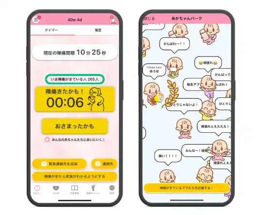 本機能は、アプリ上で「陣痛きたかも!」を記録したママの人数がリアルタイムで画面に表示するとともに、ママ同士で応援メッセージを投稿できる機能※ を追加しました。「いま、自分と同じように頑張っているママがいる」という実感を通じて、出産というライフイベントにおける励まし合いと、アプリでつながるママ同士の“支え合い”を実現します。 |