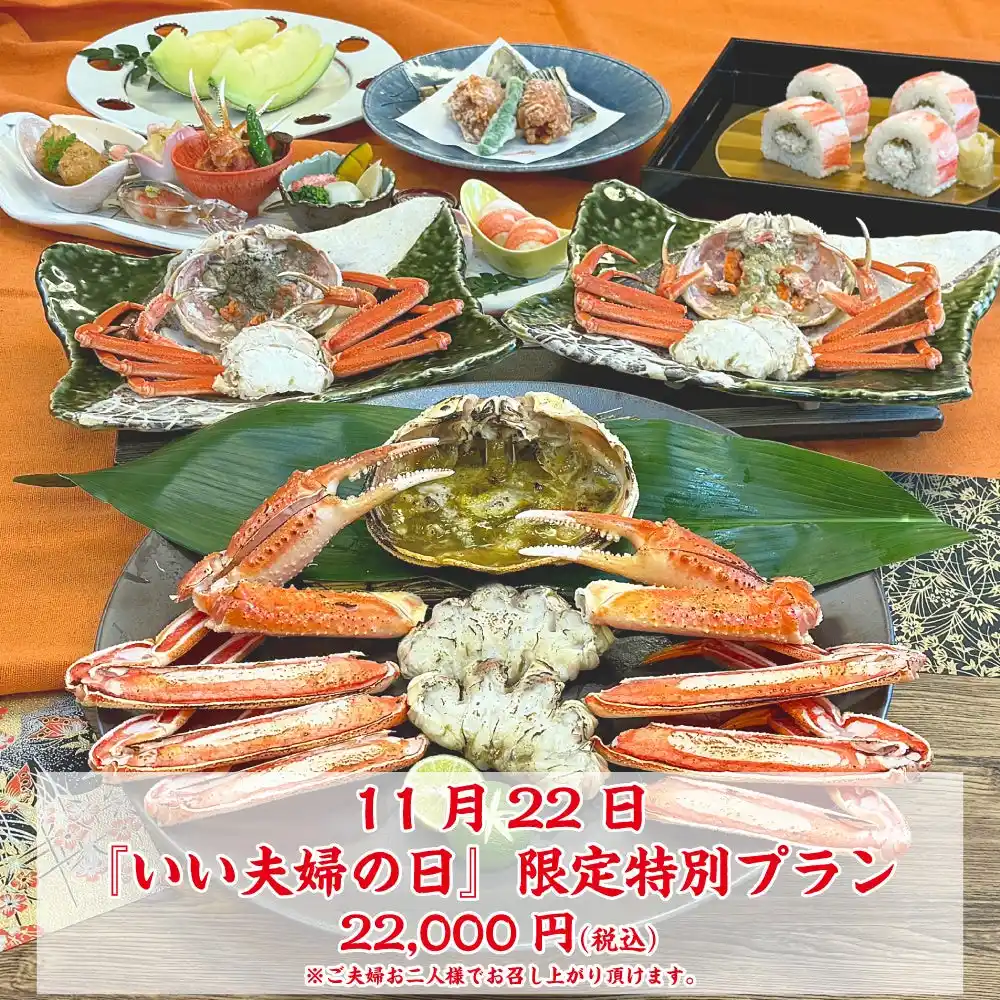 ご夫婦お2人様で来られて、厳選ズワイかにと背子かにを召し上がって頂く「夫婦の日=夫婦かにコース」を皆様にご堪能頂きたいという思いでございます。そして毎年の「いい夫婦の日(11月22日)」はかに道楽でお過ごし頂き、良い記念日になるように精一杯おもてなしさせて頂きます。 |