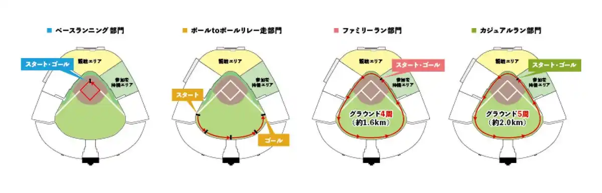 本イベント恒例の「カジュアルラン部門」、「ファミリーラン部門」に加え、今回は小学生のお子さまを対象にダイヤモンド1周を駆け抜ける「ベースランニング部門」、4人1組で外野ポール間の人工芝をリレー形式で走る「ポールtoポールリレー走部門」を新設しました。いずれの部門もランニング体験だけでなく、グラウンドレベルでの記念撮影をお楽しみいただけます。 |