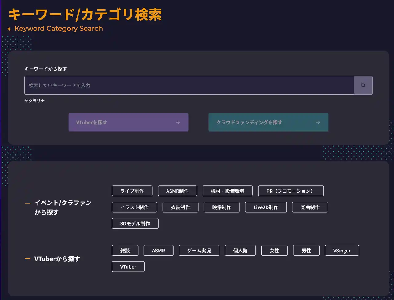 主な機能:VTuber特化型クラウドファンディングプラットフォーム、VTuberデータベース など |