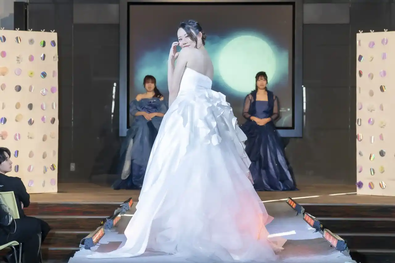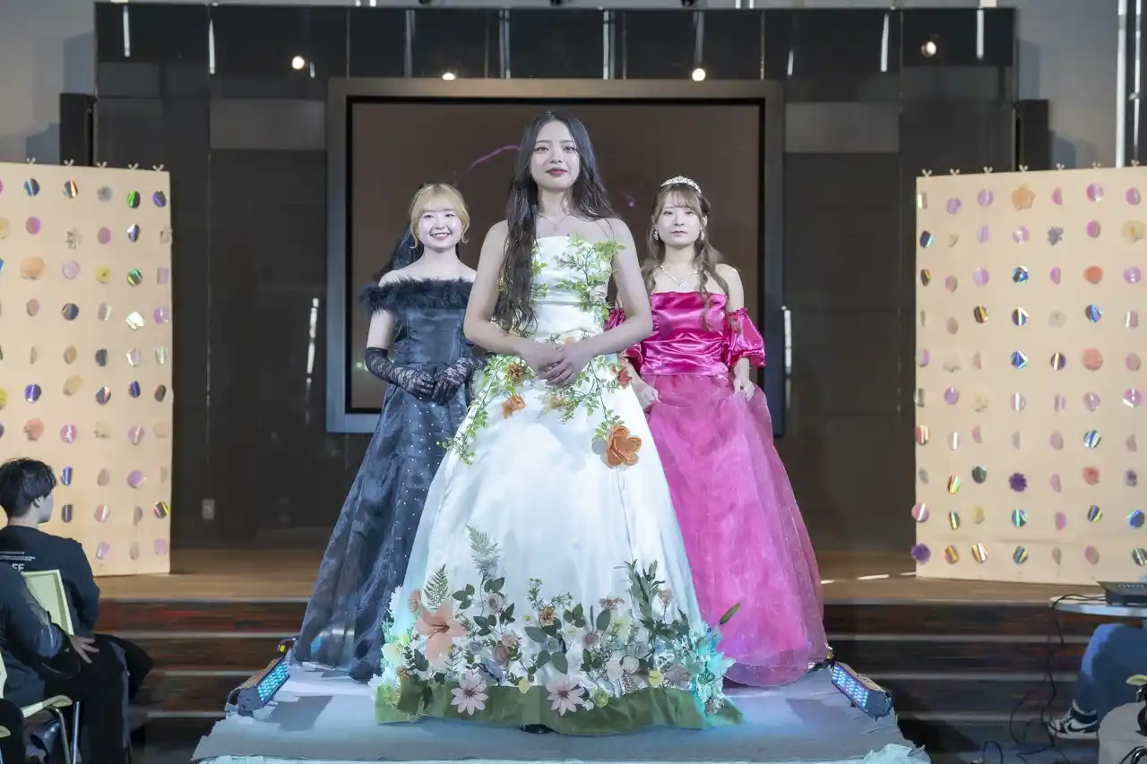 衣装や子ども服の製作、空間演出、イベントの企画・運営など生活プロデュース学科と総合ビジネス・情報学科の学生が専門的に学んできた知識や体験を生かし、学びを通じて磨いてきた個々の創造力と個性を発揮・表現する集大成の機会です。当日のショーでは、太田ゼミ・奥脇ゼミの学生がデザイン・製作した衣装を本人、またはモデル担当の学生15名が身にまといランウェーを歩きます。また、学生が製作したキッズドレスを着た教職員の子どもたちも登場します。 |