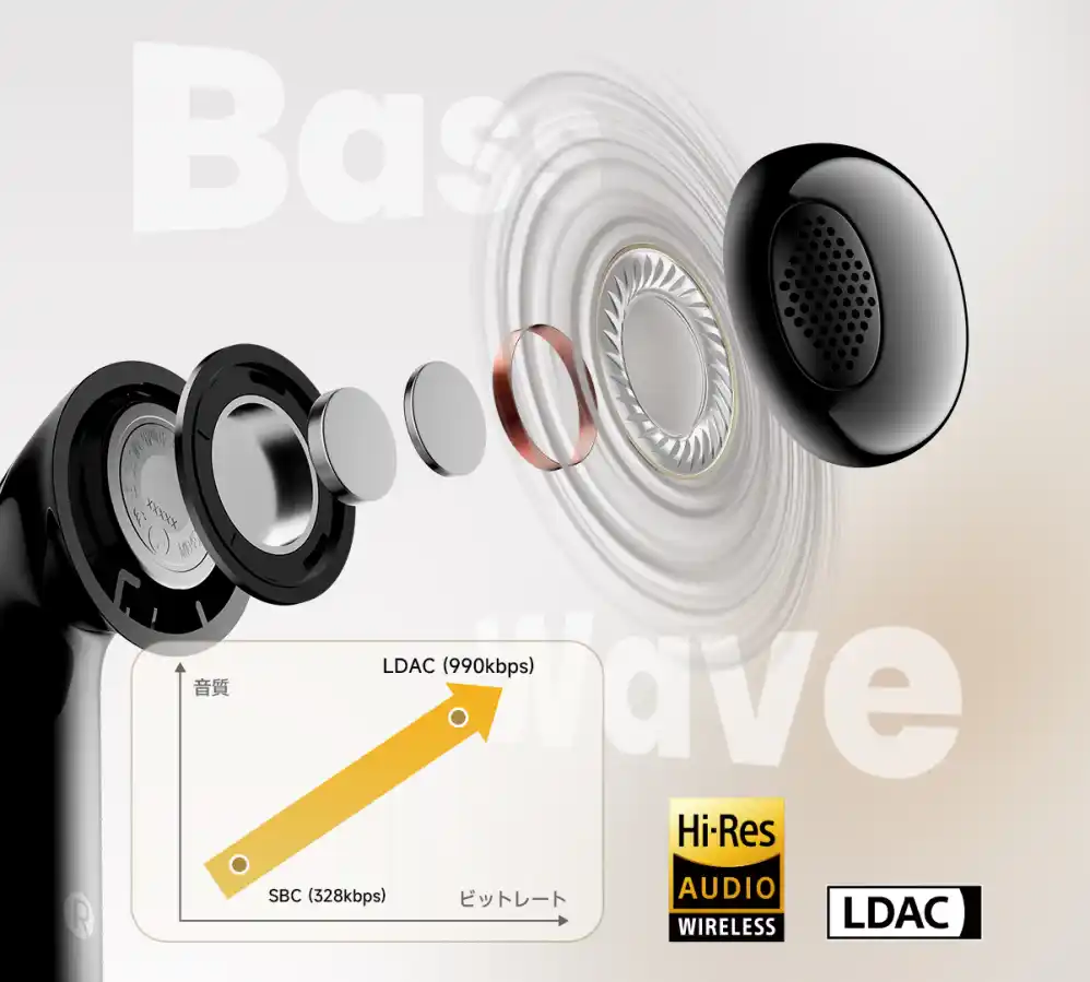LDAC HDオーディオデコード(最大伝送速度990kbps)に対応し、40kHzフルバンドの高精度なハイレ ゾサウンドを実現。 自然で立体感のある音質と、快適な装着感による没入感あふれるリスニング体験を提供します。 |