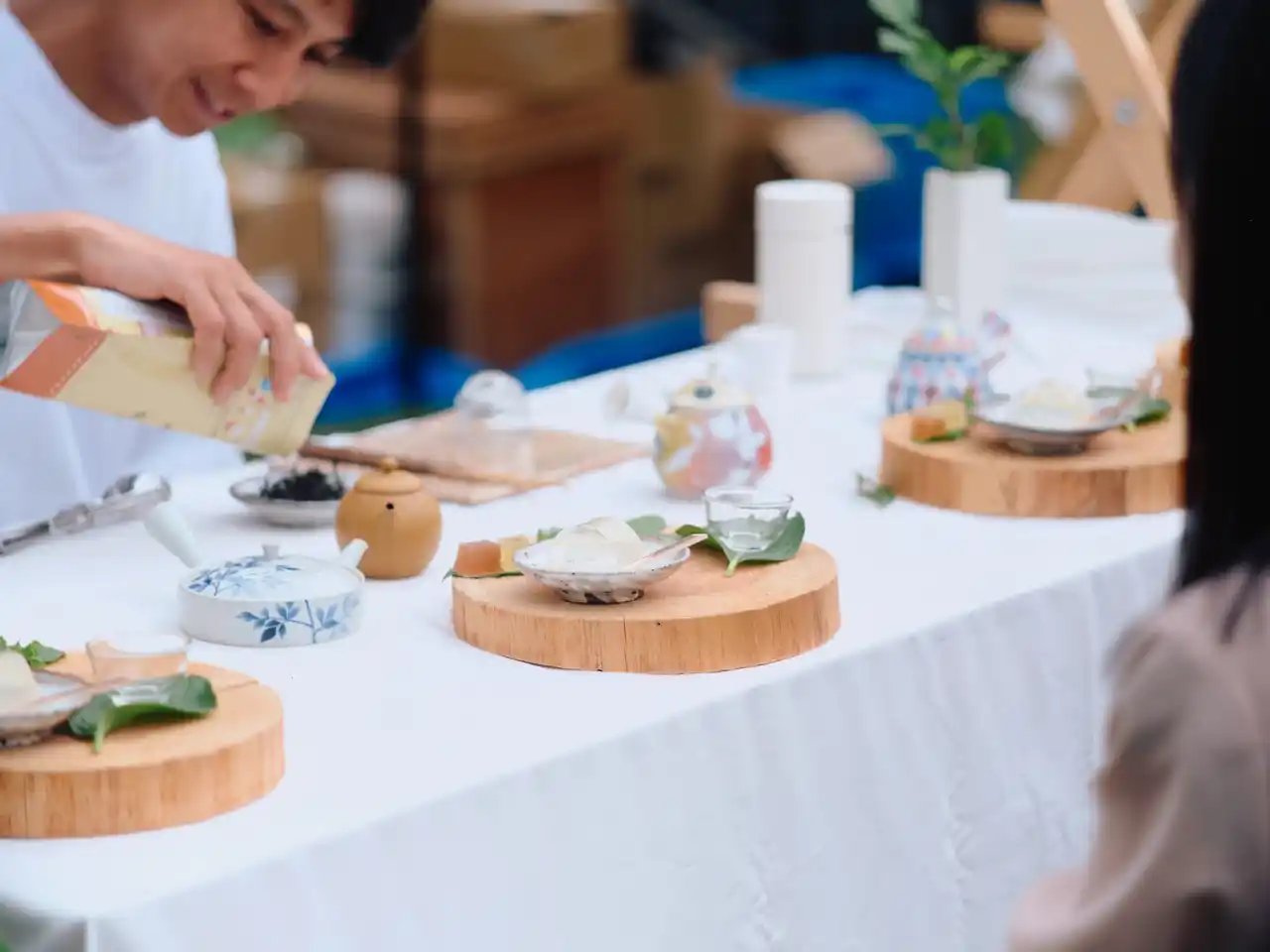 全国から58組の出店者が集結。茶農家、お茶屋、茶器作家、和菓子職人、ベーカリー、スパイスカレーなど、多彩なジャンルが“お茶”のもとに集まります。 (高香園、鈴木製茶、伊勢茶mirume、水ノ杜茶園、うてな茶園、急須のいそべ、かくの菓、テーラテール、ガレットアリチカ など) |