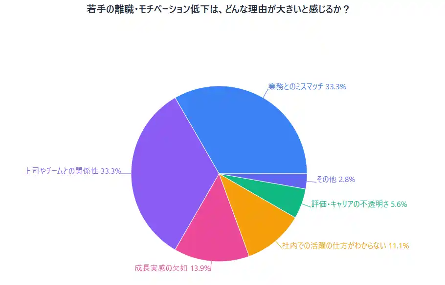 | これは、「若手の離職・モチベーション低下の理由」として「上司やチームとの関係性」(33.3%)が「業務とのミスマッチ」(33.3%)と並んでトップであることと深く関連していると考えられます。 | |||||||||