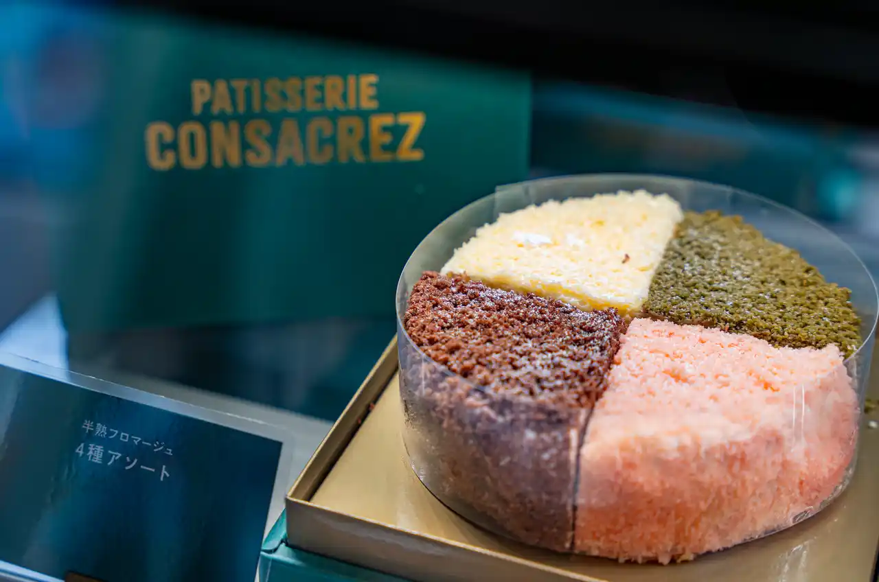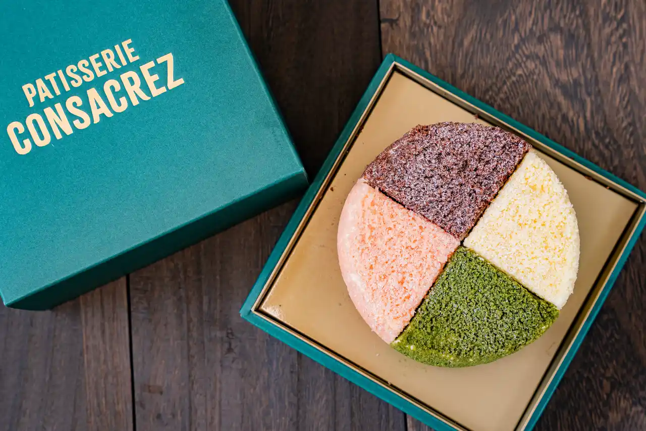 2025年10月19日オープンの「パティスリーコンサクレ神戸北野店」では、シリーズを一度に楽しめる“4種アソート”を限定販売。ホールを4分割し、それぞれ異なる味わいが楽しめる特別仕様。 並んだ4色のコントラストが美しく、まるでアートのような仕上がりです。 |