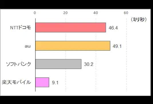 レイテンシ(遅延時間)は値が小さい方が快適だとされるが、全112地点のレイテンシ(遅延時間)は楽天モバイルが9.1ミリ秒で最短であった。ソフトバンク(30.2ミリ秒)、NTTドコモ(46.4ミリ秒)、au(49.1ミリ秒)と続いた。他の地方と同様に、楽天モバイルの遅延時間の短さが目立つ。 全112地点のレイテンシの4社平均は、33.7ミリ秒。中部地方(19.8ミリ秒)と比べると全体的に遅延時間が長いが、中国地方(平均30.4ミリ秒)とは大きく変わらない傾向である。 |