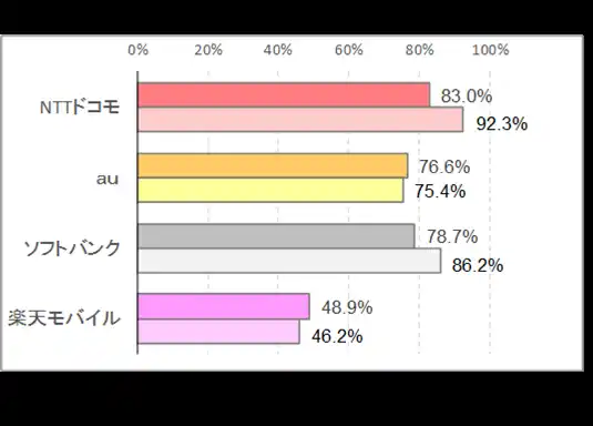 全112地点の5G受信地点比率は、4社平均で73.7%。これは、北海道・東北地方(54.9%)、中国・四国地方(61.9%)、中部地方(62.3%)と比べて高くなっており、これが下り通信速度の速さにつながっている。これを「駅ホーム」(全47地点)と「駅以外」(全65地点)に分けて見ると、「駅ホーム」は4社平均71.8%、「駅以外」は75.0%。大きく変わらないものの、「駅以外」の5G受信地点比率が若干高い。 「駅ホーム」の5G受信地点比率は、NTTドコモが83.0%でトップ、「駅以外」もNTTドコモが92.3%でトップであった。 |