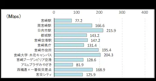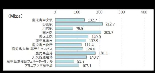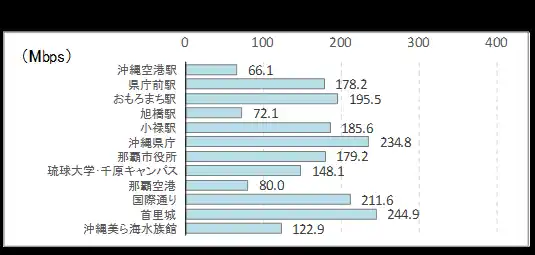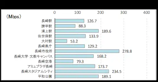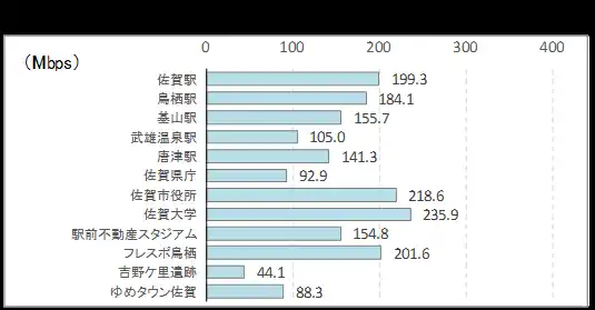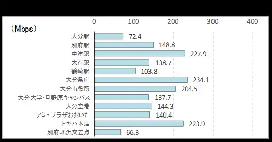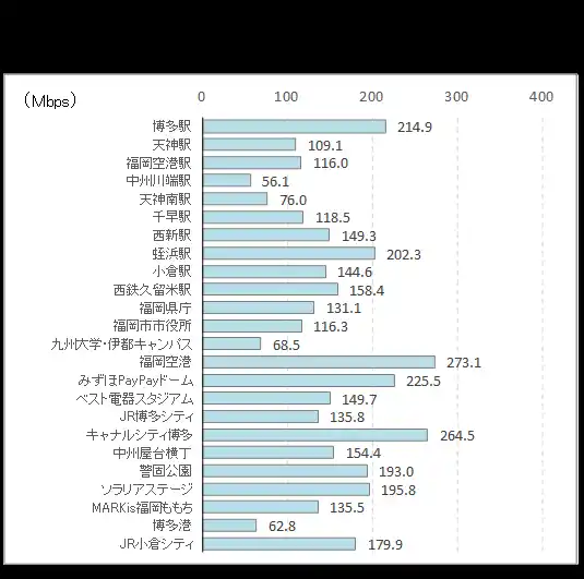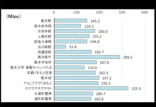 ■ 下り速度の最速地点はサクラマチクマモト(326Mbps)、最遅は吉野ケ里遺跡(44Mbps)。 |