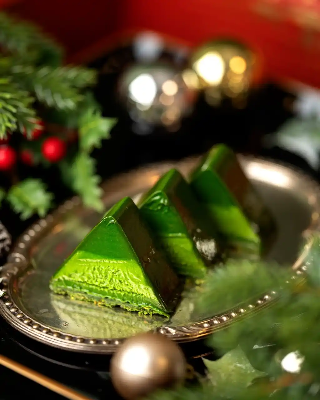 抹茶の心地よく上品な「ほろにがさ」を感じるグラサージュコーティングと、華やかな銀粉でスノークリスマスを演出。 |