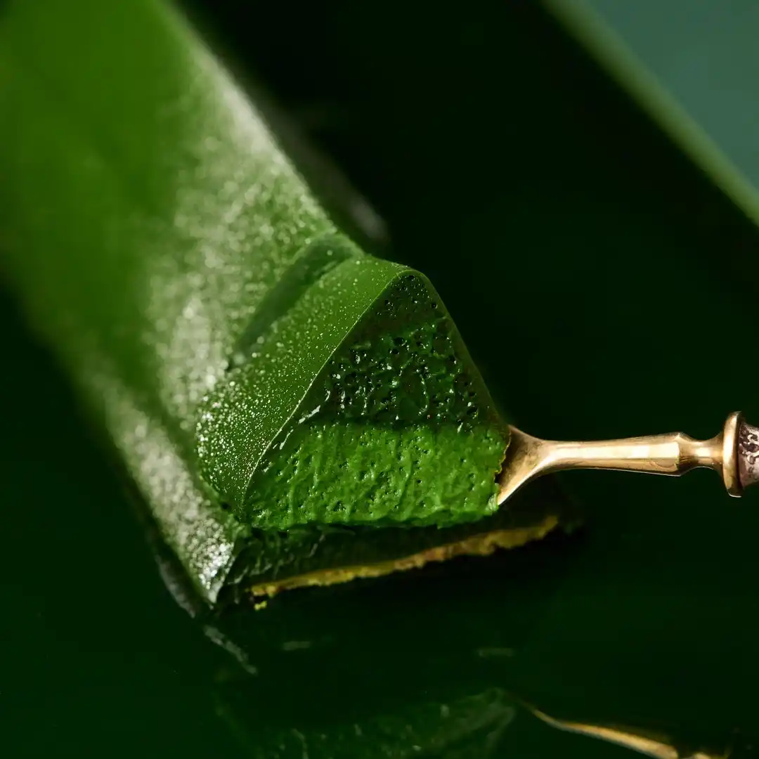より抹茶感を引き立たせるために、ケーキのベースとなるサクサク食感の「ショコラフィユティーヌ」は碾茶を使用し、その上には、濃厚な抹茶の旨味と甘味を味わえるように、塩味を効かせた「焙煎抹茶塩ガナッシュ」を添え、さらに口溶けなめらかでバランスの良い「お薄茶ショコラムース」、濃厚な「お濃茶ショコラムース」を一層づつ重ねた、贅沢なハーモニーがポイント。5層目には、上品で大人なほろ苦さを添える「抹茶ショコラ・グラサージュ」でコーティングし煌びやかに仕上げました。 |