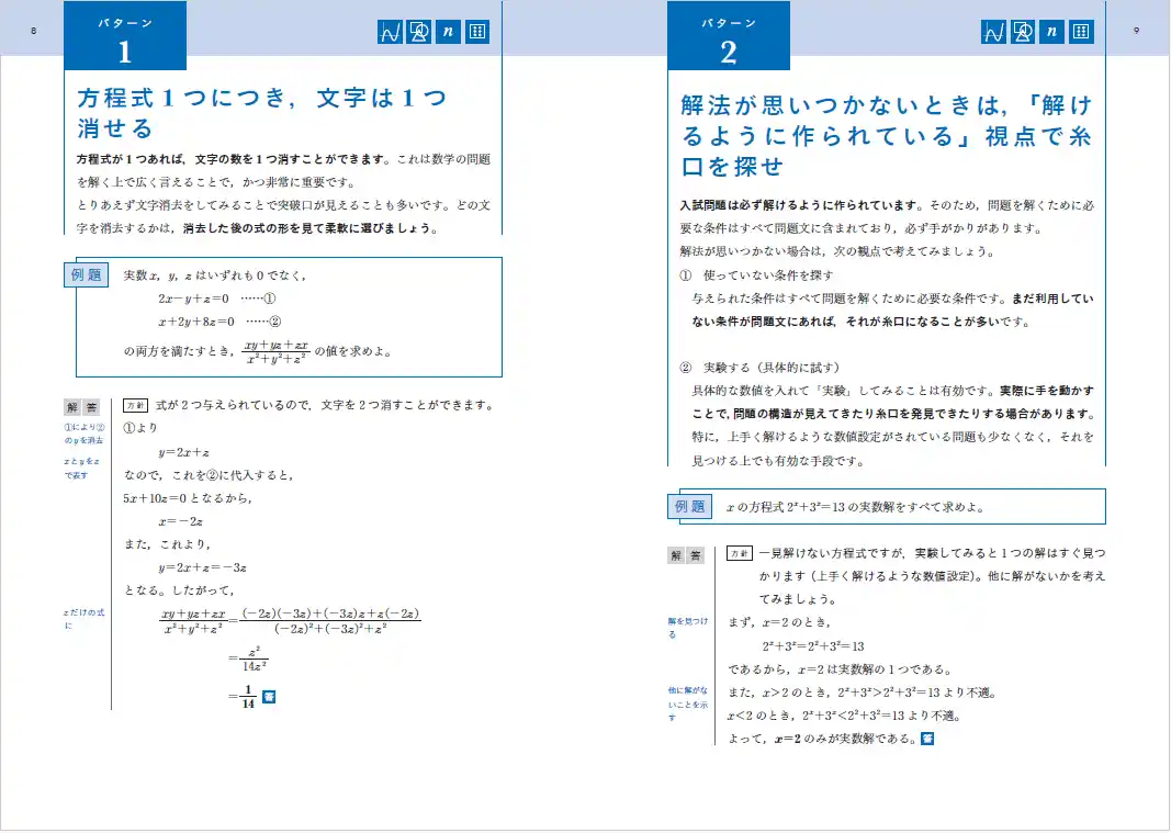 ▲パターン集。入試で役立つ、汎用性の高い考え方や解法のパターンを157掲載。各パターンには例題がついており、適切なタイミングで正しい解法を選び、使う力が身につく。 |