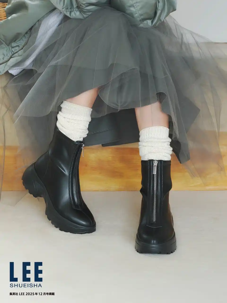 コラボ企画第2弾となる今回は、第1弾に続き『LEE』が大切にする“読者の声”に耳を傾け、スタイリストとして活躍する高橋さんが「こんなのが欲しかった」という思いを形にした、スニーカー感覚で履ける快適な履き心地のブーツシリーズです。昨今ブーツトレンドの中でも注目を集める「フロントジップ」タイプと、王道のBLACKと抜け感満点のWHITEのカラー展開「サイドゴア」タイプの2型を取り揃えております。 |