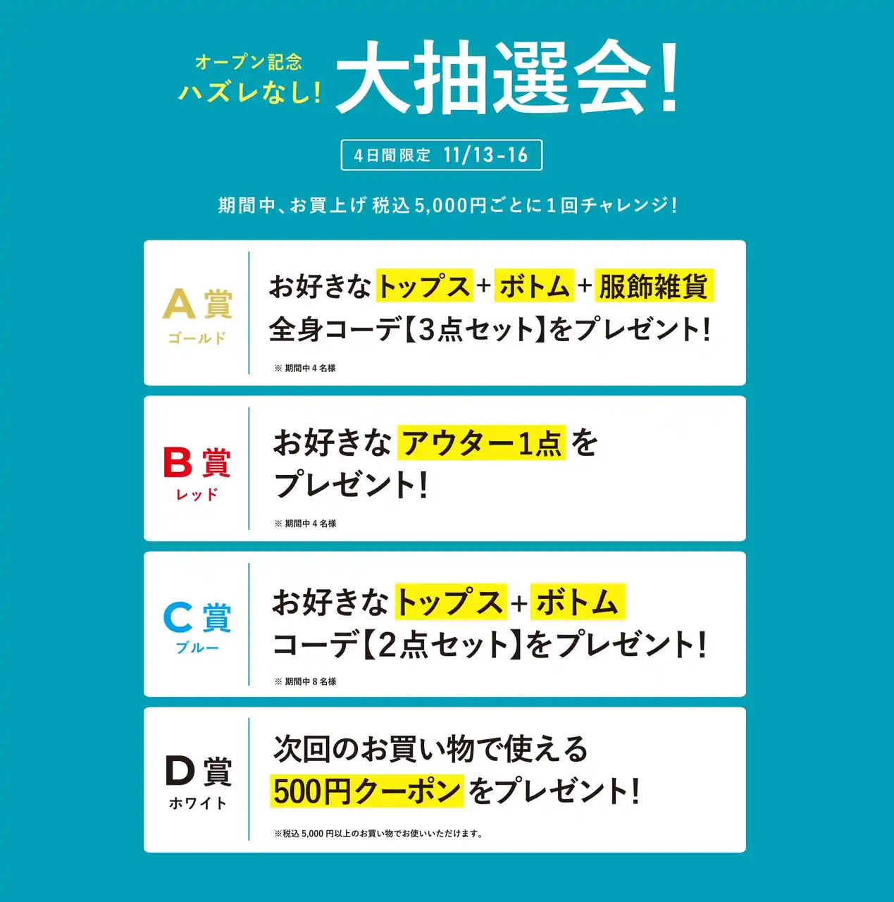 | 税込5,000円以上ご購入ごとに1回ご参加いただける抽選会を開催。 | |||||||||