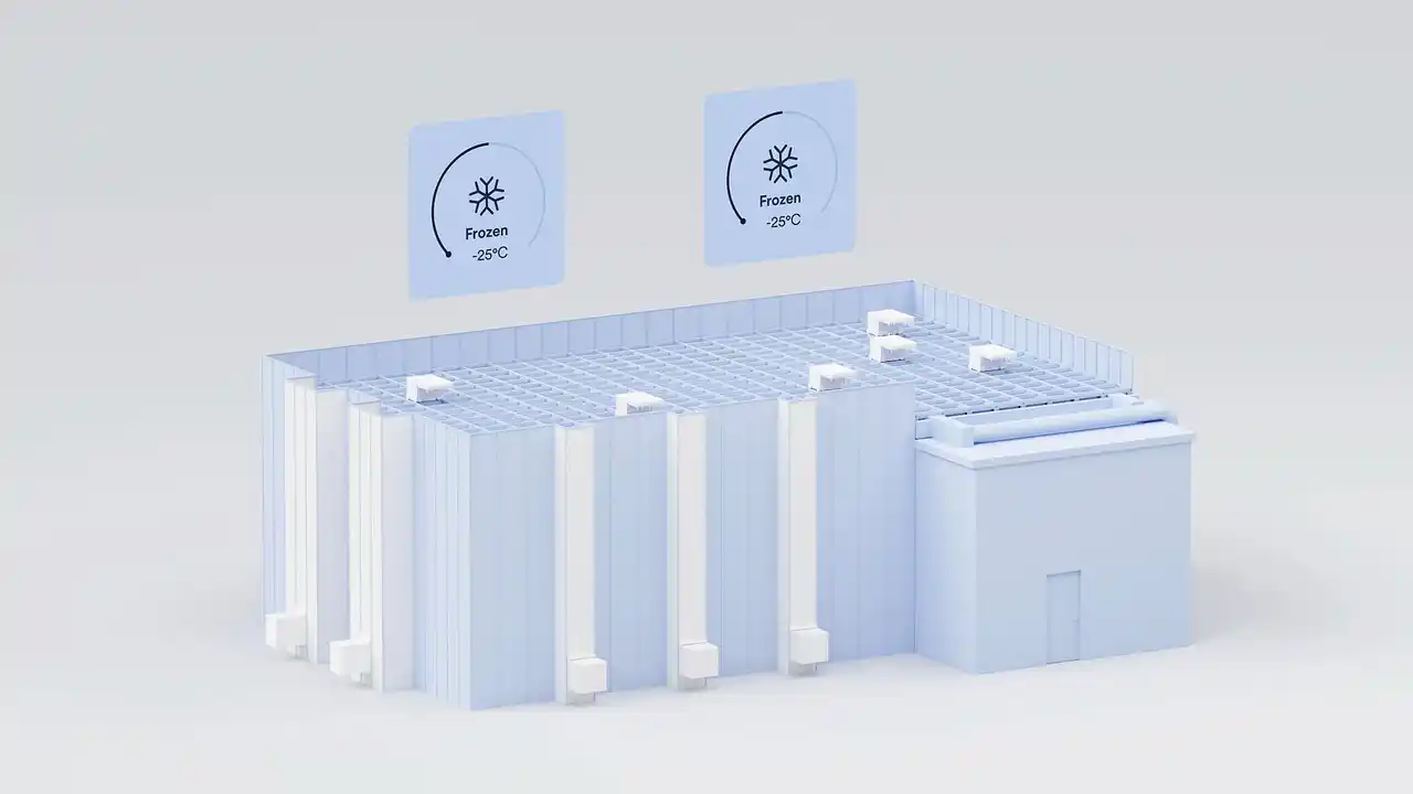 AutoStoreの既存ソリューションであるチルド・冷凍温度帯対応であるMTS(Multi-Temperature Solution(TM))の冷凍保管のみに特化したシステムです。エネルギー使用量を削減し、作業者の安全性も向上させます。冷凍という、最もコストがかかり複雑な環境下でも、常温倉庫と同様に高い信頼性を発揮します。 |
