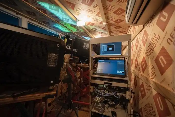 投影は、会場東ゲートの外側に設置したコンテナから、全長約132mもの壁面を余すことなく使用するため、5万ルーメンの高輝度プロジェクター5台を横に並べて実施されました。コンテナ内部は、オペレーション作業を行うためのわずかなスペースがある以外、数多くの精密機器で埋め尽くされていました。「MEGA CANVAS」では、「時間」「地域」「夢」「笑顔」「文化」というテーマに沿った映像作品が投影され、大阪府や観光事業者、アーティスト、学生など多様なパートナーが作品を出品しました。万博開催中、東ゲートから見えるヨコレイの物流倉庫は存在感が抜群で、パビリオンと勘違いする人も多かったとされています。 |
