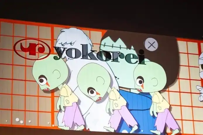 作品は企画から制作まですべてを学生自身で行いました。アイデアは、学生全員で話し合ううちに日本の「百鬼夜行」に固まりましたが、客員准教授の川坂先生からの「そのままやるのでは面白くないので、もうひと工夫ほしい」という要望を受け、これを世界の文化へと広げ、九尾の狐や一つ目小僧など日本の伝統的な妖怪はもちろん、ユニコーン、イエティ、ドラキュラなどの海外由来のキャラクターも数多く登場するパレードとして完成させました。これにより、全長132mの巨大なコースを賑やかに練り歩く映像となりました。 |
