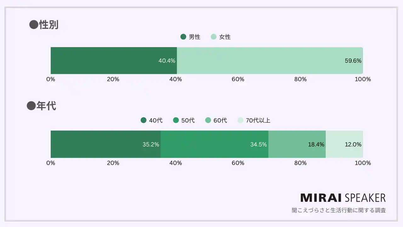 「100年の人生をテクノロジーで豊かにする」という想いのもと、テクノロジーの力で、誰もが明るく前向きに暮らせる社会づくりをめざす株式会社ミライスピーカー(所在地:東京都中央区、代表取締役社長:山地浩、以下「当社」)は、聞こえづらさと生活行動に関する調査を、全国の40歳以上の男女267名に対して実施し、その結果を発表しました。 |