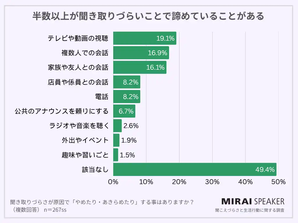 約半数の人が“聞こえづらさが原因で何かをあきらめた経験がある”と回答。「テレビ視聴」「複数人での会話」「家族や友人との会話」が上位を占めました。 |