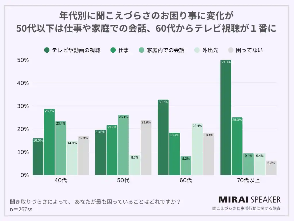 年代別に見ると、40代は「仕事」、50代は「家庭内での会話」、60代以上では「テレビや動画の視聴」が突出し70代では約半数が困っていると回答しました。一方、「外出先で困る」割合は60代が他の年代と比べて最も高くなっています。 |