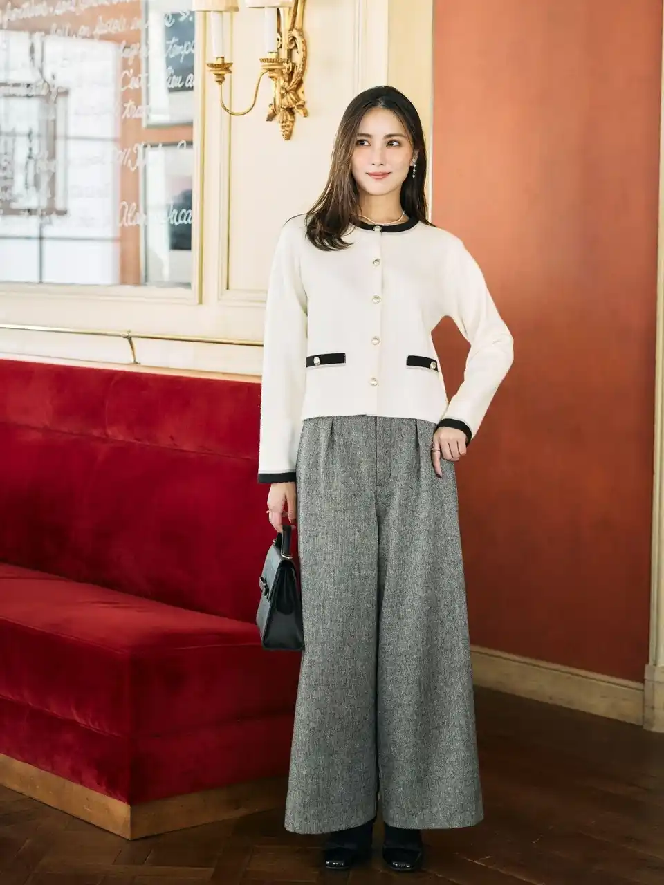 | Cardigan ¥6,600 Pants ¥6,990 Boots ¥9,900 Bag ¥7,990 Earrings ¥2,500 | |||||||||