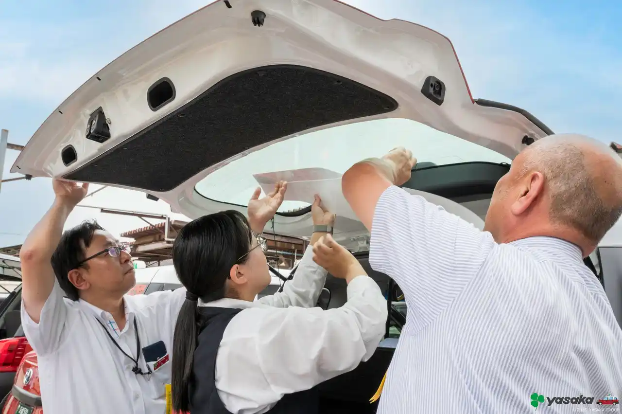 担当ドライバーと職員で取り付けられるリアステッカー |