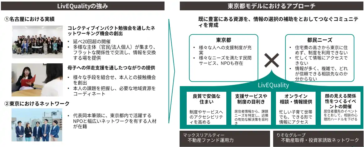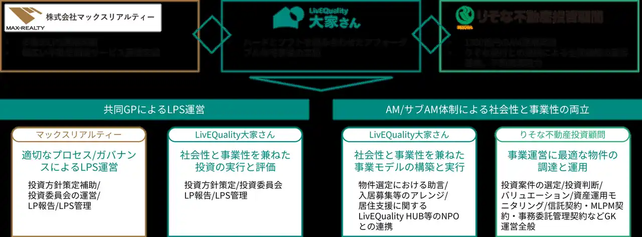 LivEQuality大家さんは、名古屋でのアフォーダブル住宅運営と居住支援の実績をもとに、りそな不動産投資顧問・マックスリアルティーが持つファンド設計・運営の専門性を融合。官民・金融・社会の力が連携した、日本初のアフォーダブル住宅モデルとして、それぞれの強みが生きた協働体制を構築しています。 |