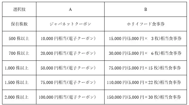 ・選択式の株主優待となりますので、別途ご案内にて回答期日を設けさせていただきます。期日までにご回答がない場合は、当社食事券(B)を発送いたします。 |