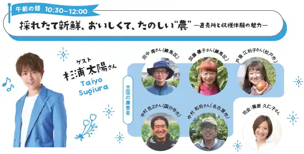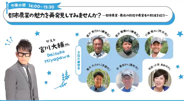 全国から集う10名の農業者とスペシャルなゲストが都市農業の魅力や楽しみ方を語り合います。 |