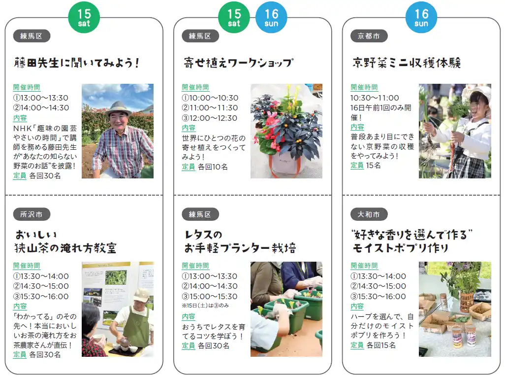 練馬区をはじめ、32自治体の農産物や特産物などが購入できるマルシェのほか、各地の農産物・特産物を使用したメニューを提供するキッチンカーの出店、農業者が講師となるワークショップ、全国の農業者10名とスペシャルゲスト(杉浦太陽さん、宮川大輔さん)を招いたトークライブなど、都市農業の魅力を存分に味わうことができるコンテンツが目白押しです。 |