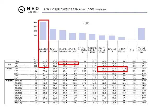 全体の41.2%が「家族の精神的支え・供養」を主な許容目的として挙げており、AI技術を感情面の支えとして受け入れる傾向があることがわかりました。特に女性はその傾向が顕著で、45.4%がこの目的での利用を許容すると回答していました。 |