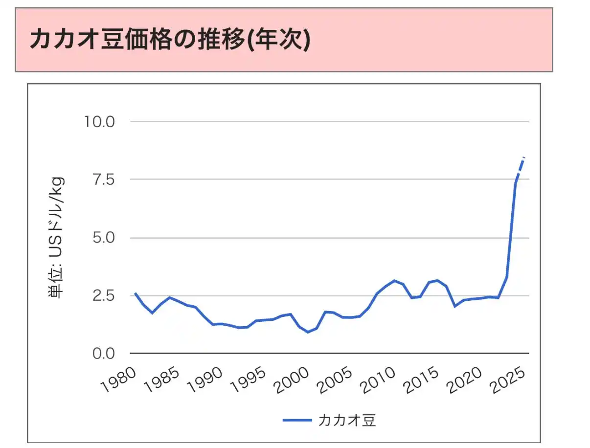 全ての商品が値上がる中、チョコレートの原料となるカカオは3年前の約3倍の価格。 |