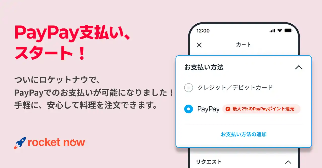 フードデリバリーサービス「ロケットナウ」では、新たな決済方法として「PayPay」を導入いたしました。これにより、従来のクレジットカード決済に加えて、「PayPay」のお支払いも可能となり、ユーザーの皆さまには、より安心で簡単にサービスをご利用いただけます。すでに多くの方に親しまれている「PayPay」を通じてアプリ上での決済がより迅速かつスムーズに完了、外出先や忙しい時間帯でも、スマートフォンひとつでスムーズにご注文いただけます。 |