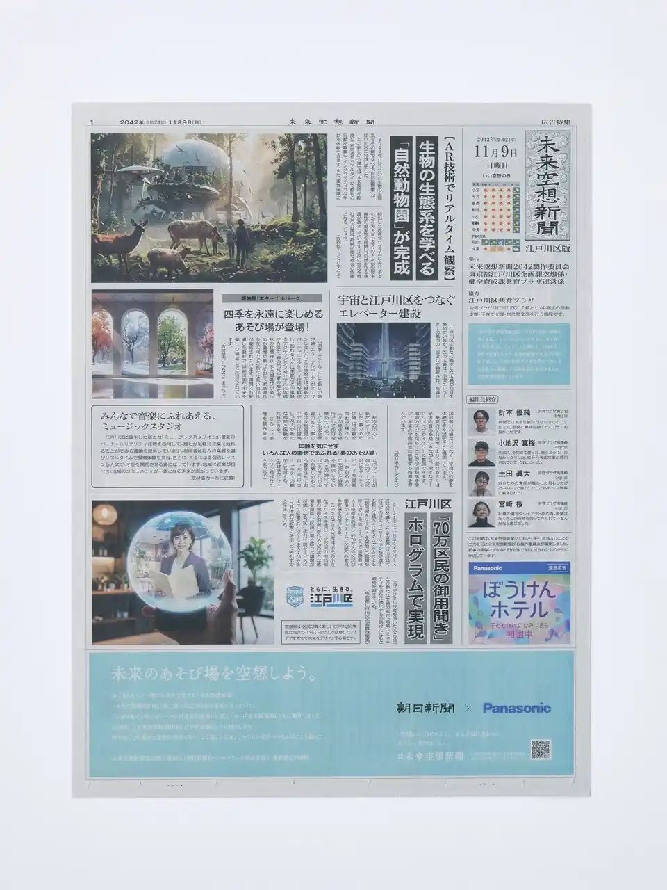 「未来の定番」をつくることを目指すパナソニックと、「つながれば、見えてくる。」をスローガンとする朝日新聞社の共創プロジェクトです。未来空想新聞2042の発行を通じ、多くの人が未来に向けて語り合う機会を提供し、希望に満ちた未来の実現に貢献します。 |