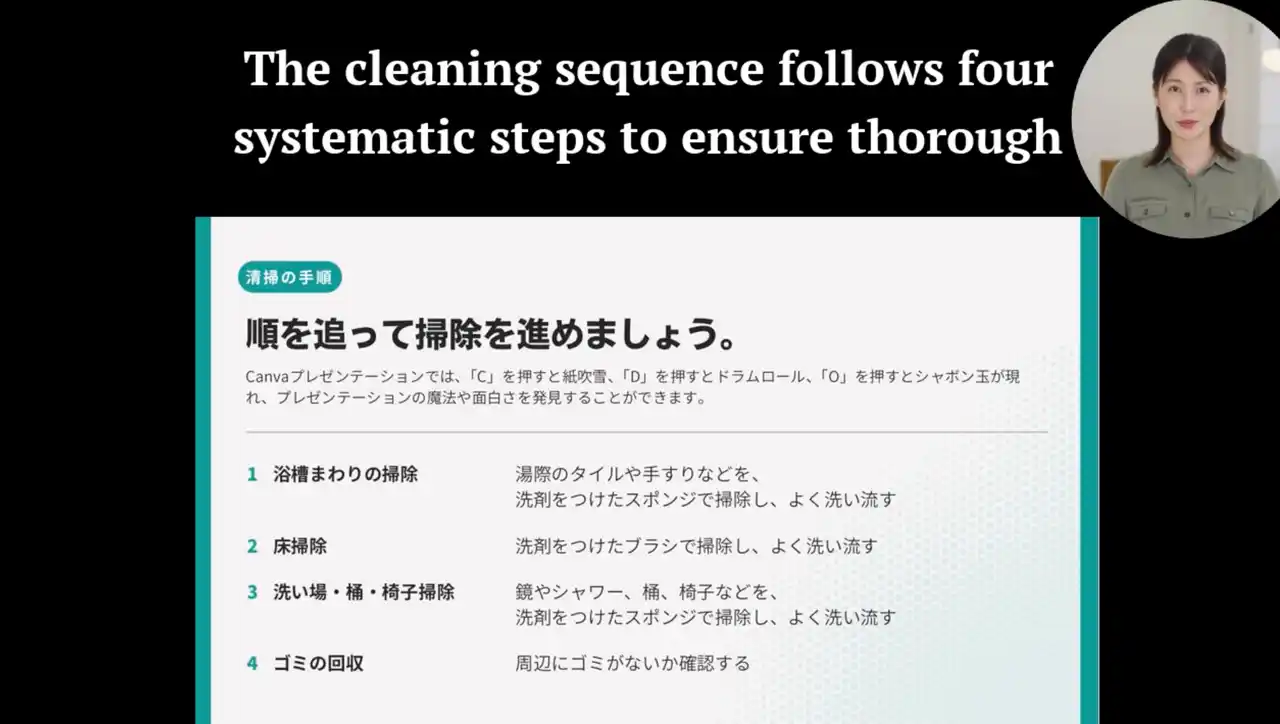 日本語版のマニュアルをもとにして、即座に英語の解説動画を生成。日本で働く外国人労働者はもちろん、グローバルに展開する企業においては、海外拠点の外国人の従業員が、新しい業務知識をタイムラグなく習得できます。テキストベースのマニュアルでは伝わりにくい複雑な操作や微妙なニュアンスも、視覚と聴覚に訴える動画で直感的に理解を促し、習熟度のバラつきを防ぎます。 |