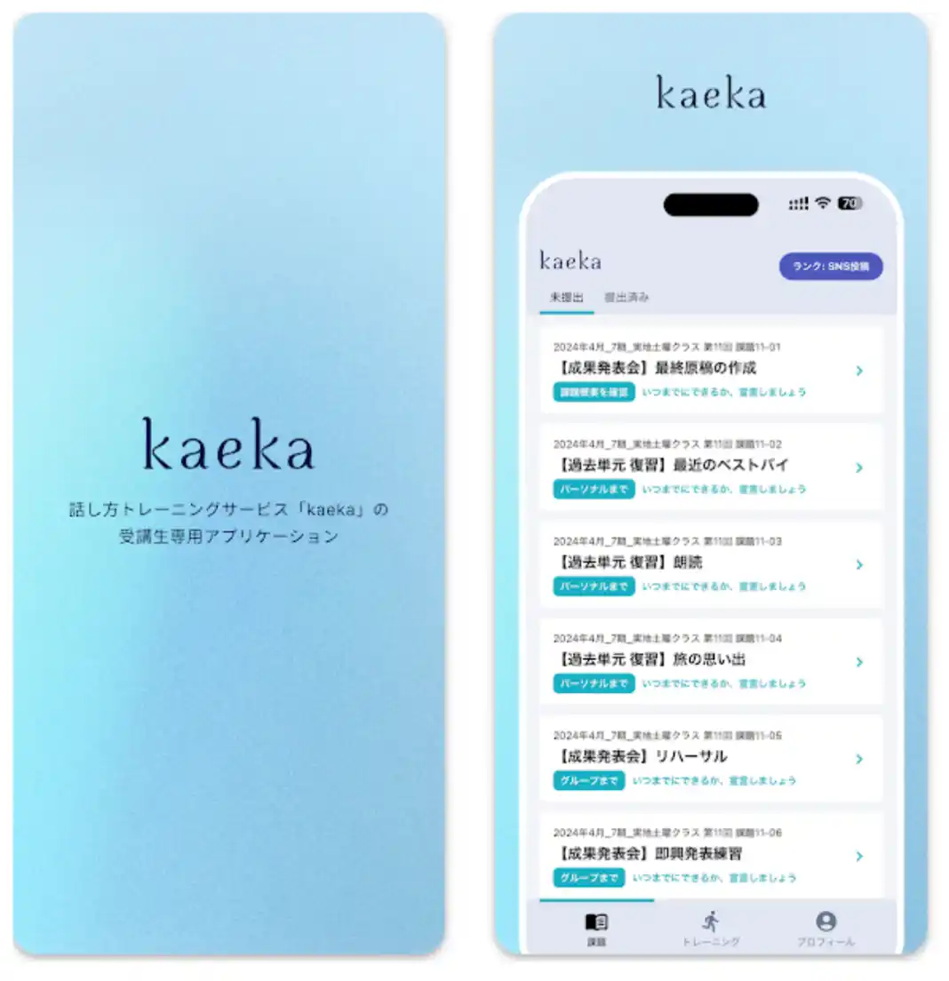 | 話し方トレーニングサービス「kaeka」の受講生専用アプリケーション 「kaeka portal」 は、“学習の自走性”を引き出す体験設計により課題提出率91%※1を実現しました。 |