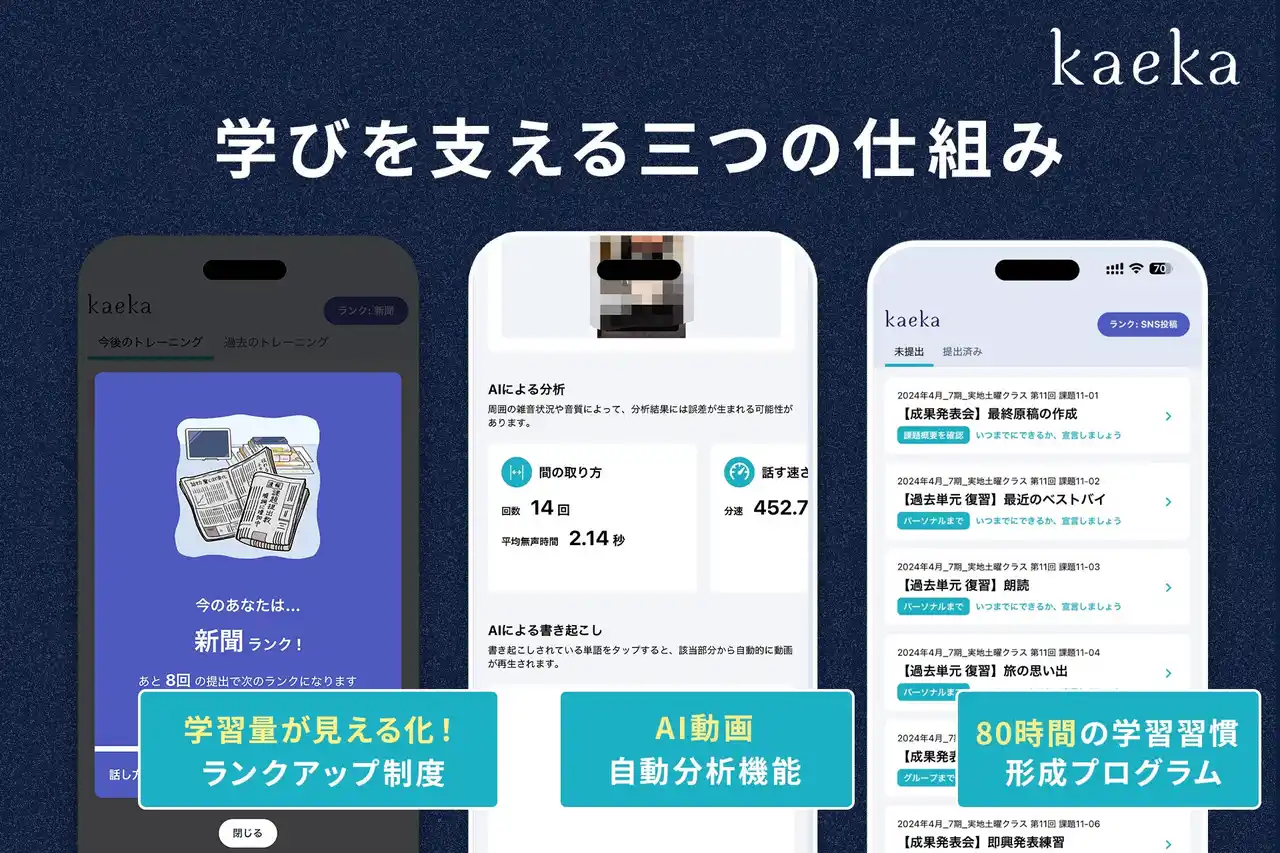 | kaekaは、話し方は受講中だけでなく終了後も実践してこそ力になると考え、そのために受講者の自主性を育むことを重視しています。こうした思想のもと、「kaeka portal」は2025年4月リリース以来、iOS・Android対応の学習環境を提供しながら、習慣化を軸に改善を重ねてきました。さらに最新アップデートでは採点を完全AI化し、課題提出から約10分で分析データを確認できるようになり、学習をスムーズに継続できる環境を実現しています。 | ||||||||||||
