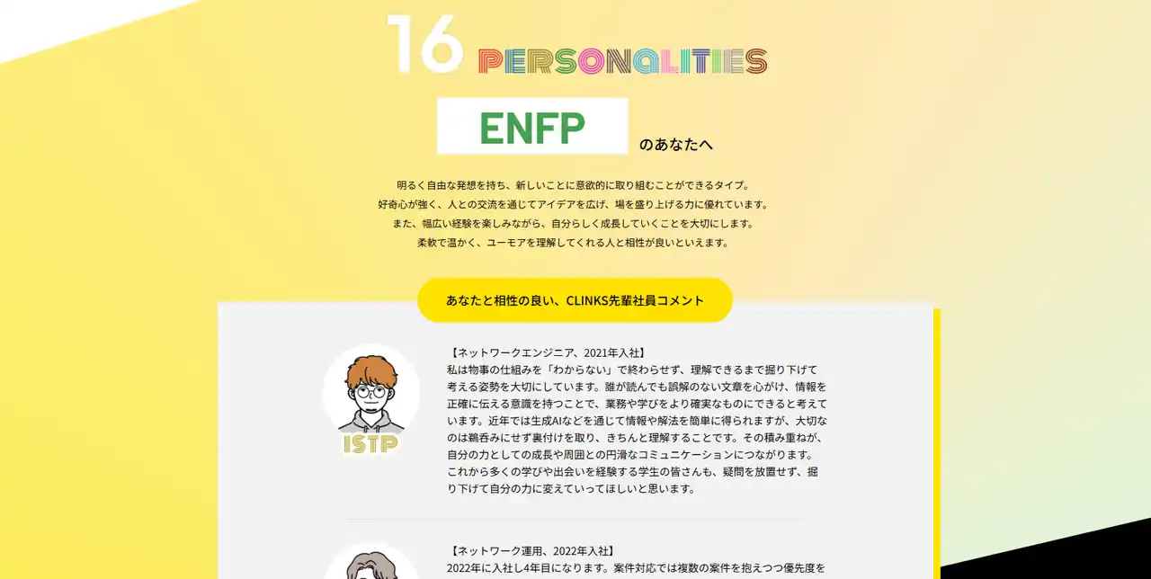 AIサービスやシステム開発を手掛けるCLINKS株式会社(本社:東京都中央区、代表取締役:河原浩介)は、2025年11月5日(水)、採用サイトに性格診断を活用した「16 PERSONALITIES by CLINKS」を実装いたしました。求職者が自身の性格を選択すると、相性の良い性格タイプの先輩社員からのメッセージが表示され、入社後の職場環境をより具体的にイメージできる仕組みです。 |