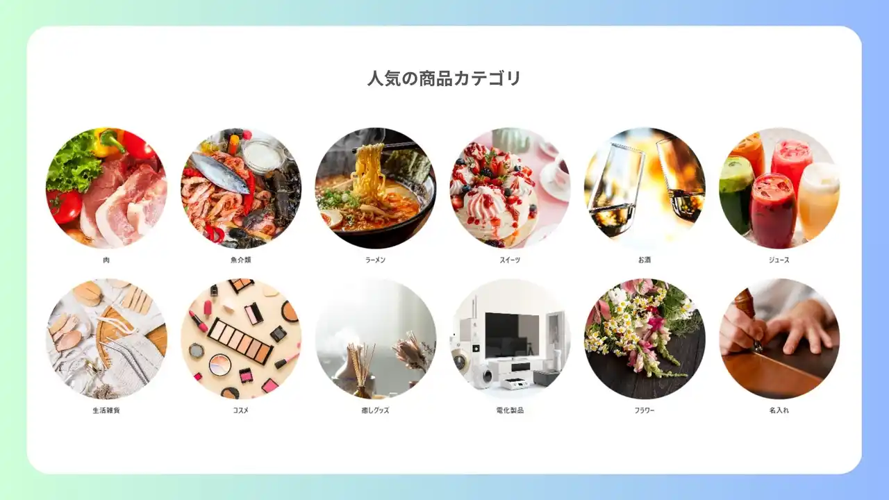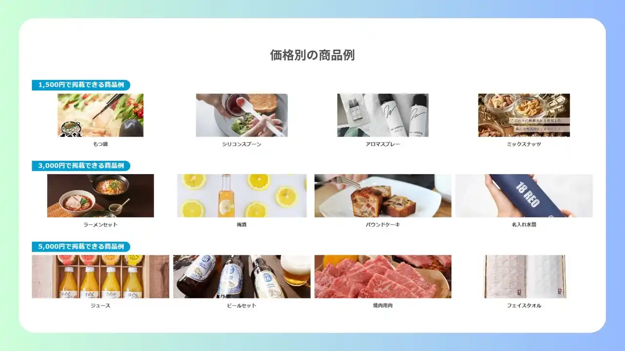 オリジナルeカタログギフトに掲載可能な商品は、食品・ドリンク、スイーツ、生活雑貨から電化製品、ペットグッズ、名入れ商品等、全17カテゴリ・1万点以上。 |