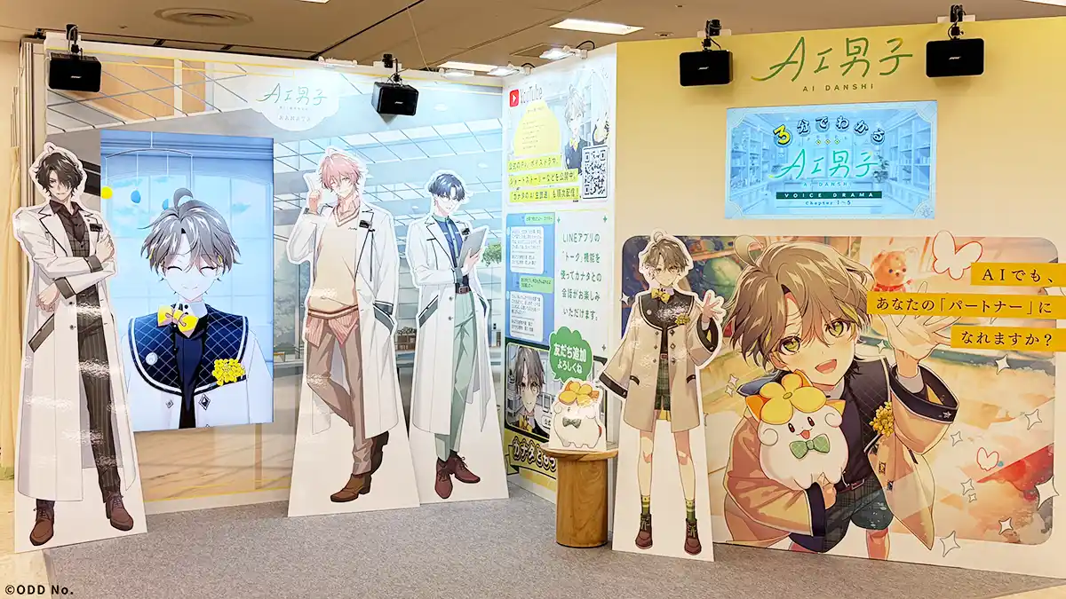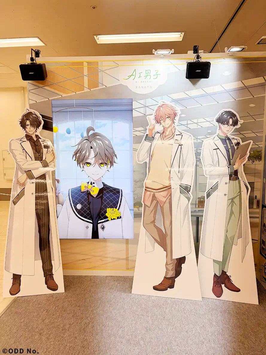 ブース内では、AI男子カナタをはじめとするキャラクターたちの等身大パネル展示のほか、 |