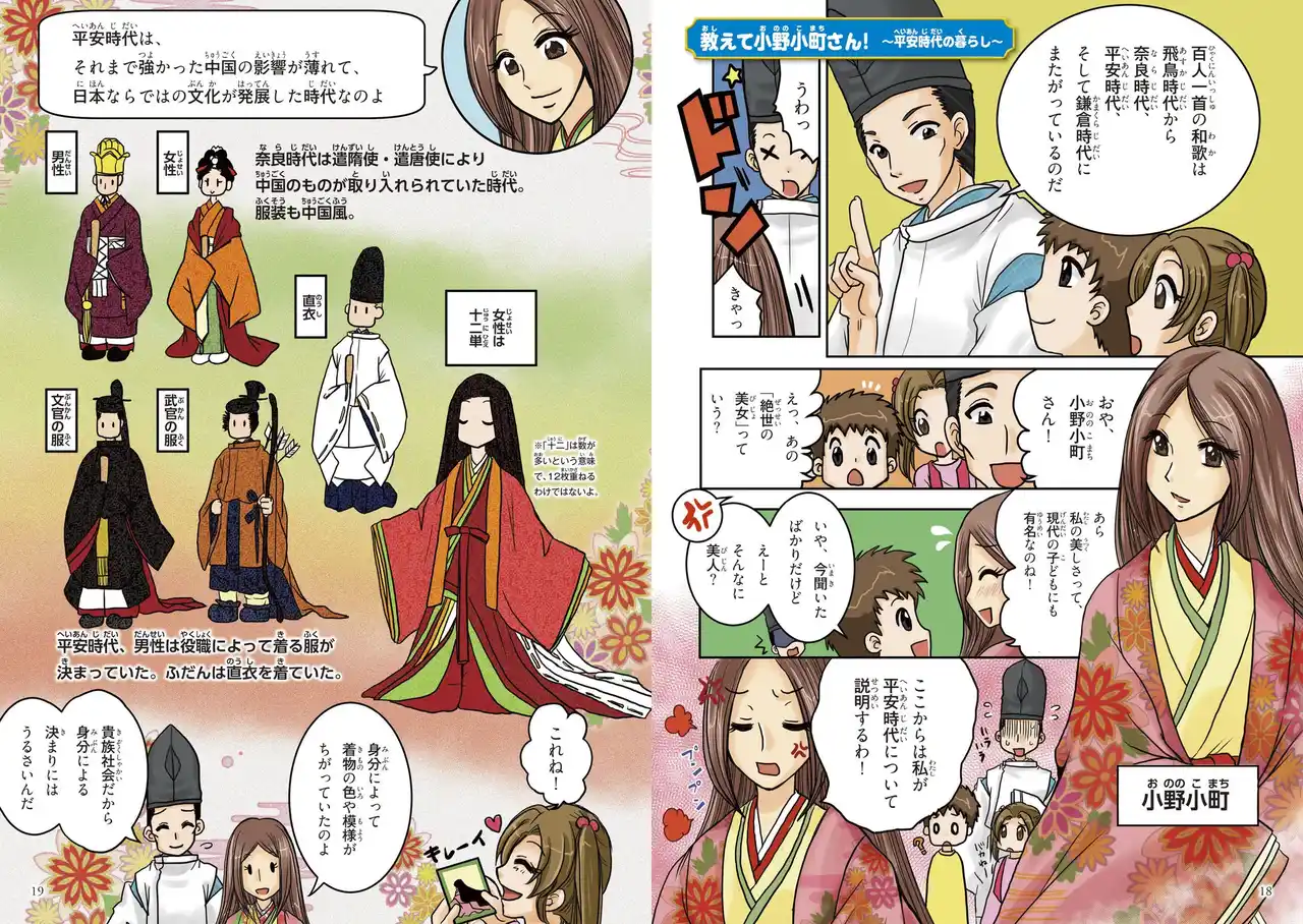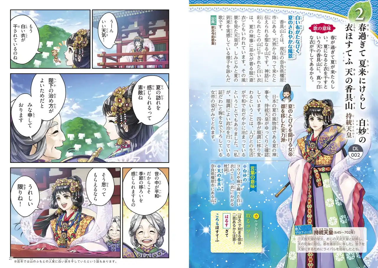さらに各章の冒頭には、歌が詠まれた時代の人々の暮らしや習慣、恋愛事情などをまんがで紹介。楽しみながら歌の理解が深まります。 |