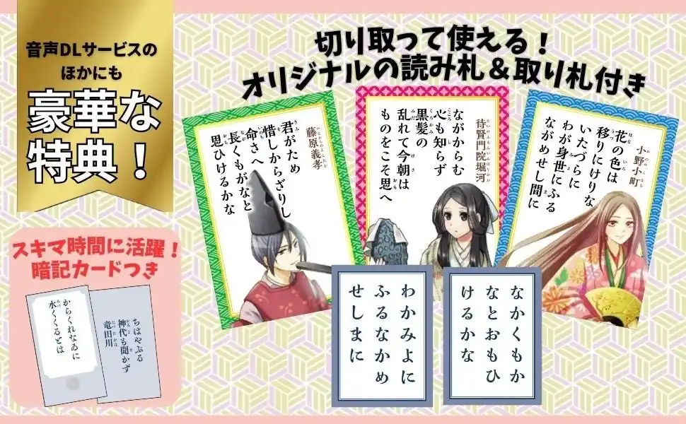 和歌の読み方を確認できる上、暗記するときや、手軽にかるた遊びをするときにも大活躍する音声ダウンロードサービスが付いています。スマホやパソコンで音声を再生できます。 |