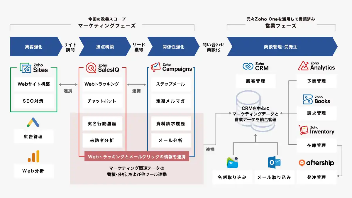 ●ツール活用の混乱を解消し、成果につながる運用を設計 Zohoアプリケーションの操作支援にとどまらず、マーケティング戦略から仕組み化まで一貫して支援できる点を決め手に、バディマーケティングにコンサルティングを依頼しました。同社は、Zoho Oneの各アプリケーションの役割を整理し、施策の全体像と優先順位を可視化した「マーケティング設計図」を策定。業務目的から逆算した運用方針の確立により、ツールのムダや混乱を解消し、効率的な商談創出体制を実現しました。 ●自社Webを起点に「回るマーケティングの仕組み」を構築 策定した「マーケティング設計図」に基づき、資料請求からWeb接客まで一貫した連動導線を構築。具体的には、Zoho CRMとSalesIQ、Campaigns、Sitesを連携させ、Webサイト訪問者の行動をリアルタイムに可視化し、最適なタイミングでの自動メール配信やアプローチを実現することで、自社Webを起点としたリード育成・商談化を可能にしています。 |