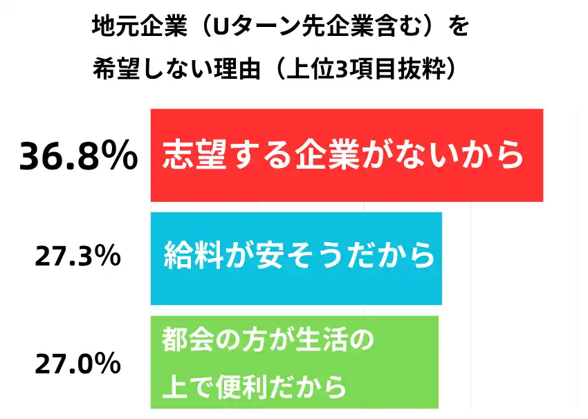 株式会社マイナビ「2026年卒大学生Uターン・地元就職に関する調査」によると、「地元(Uターンを含む)での就職を希望する」と答えた学生は56.4%。つまり半数近い学生が地元から離れることを考えていると捉えられます。その理由として最も高い選択肢が「志望する企業がないから(36.8%)」です。 |