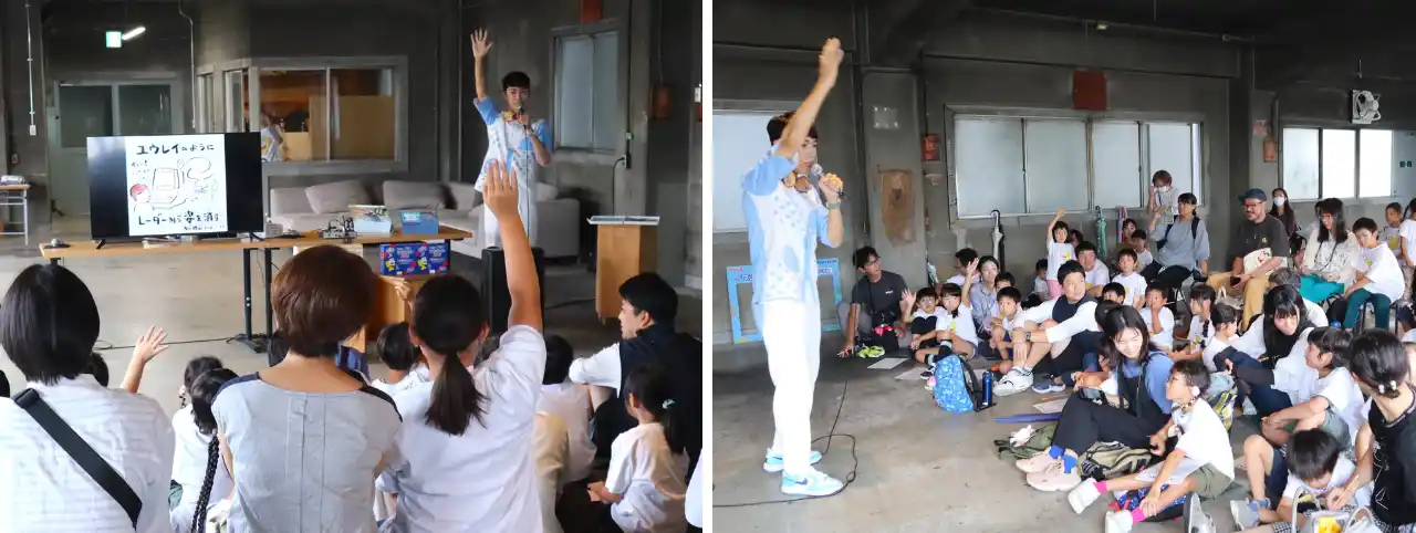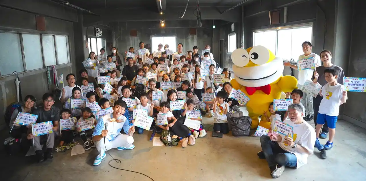 当日はあいにくの雨で、「施肥(海への肥料まき)」の見学は中止となりましたが、屋内にて「さかなのおにいさん かわちゃん」によるスペシャルワークショップを開催。会場は子どもたちの元気な声であふれ、イワシや海の生き物のクイズやトークを通して、海の環境や命のつながりについて楽しく学ぶ時間となりました。 |