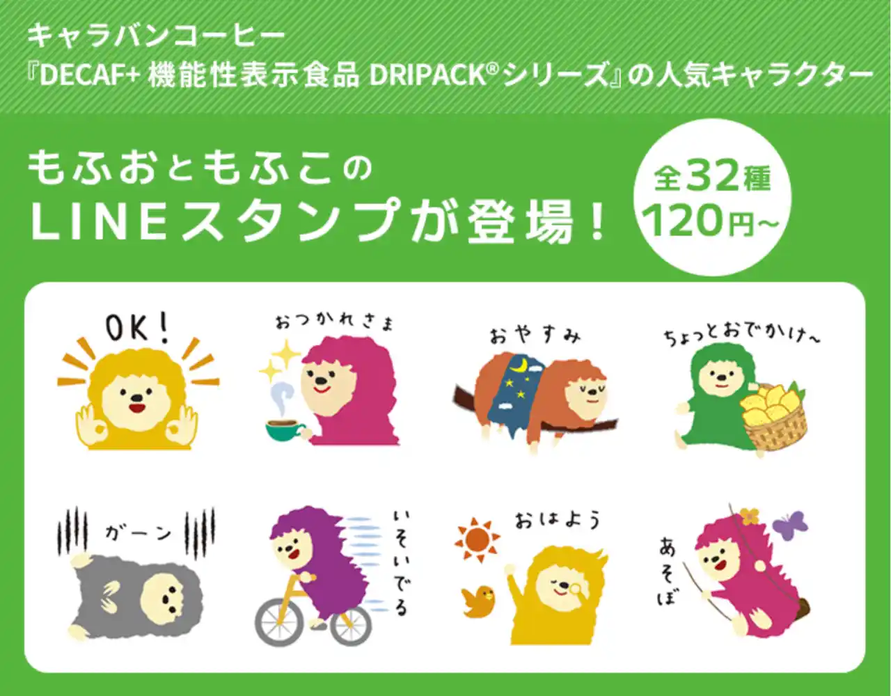 | キャラバンコーヒー『DECAF+機能性表示食品 DRIPACK(R)シリーズ』の人気キャラクター『もふおともふこ』のLINEスタンプが出来ました!!もふおともふこは不思議な生き物。毎日使えるスタンプ集です。 | ||||||||||||||