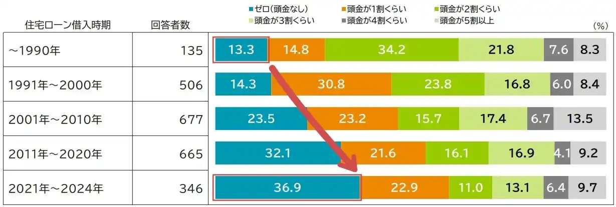 しかし、2021年~2024年の借入れでは、「頭金ゼロ」が36.9%で最も多く、「1割くらい」も22.9%と高い割合を占めています。一方で、かつて主流であった、「2~3割くらい」は合わせても24.1%にとどまります。 |